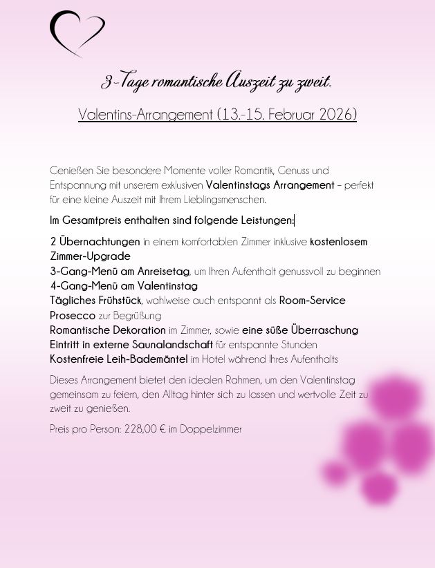 Genießen Sie besondere Momente voller Romantik, Genuss und Entspannung mit unserem exklusiven Valentinstag Arrangement - perfekt für eine kleine Auszeit mit Ihrem Lieblingsmenschen.